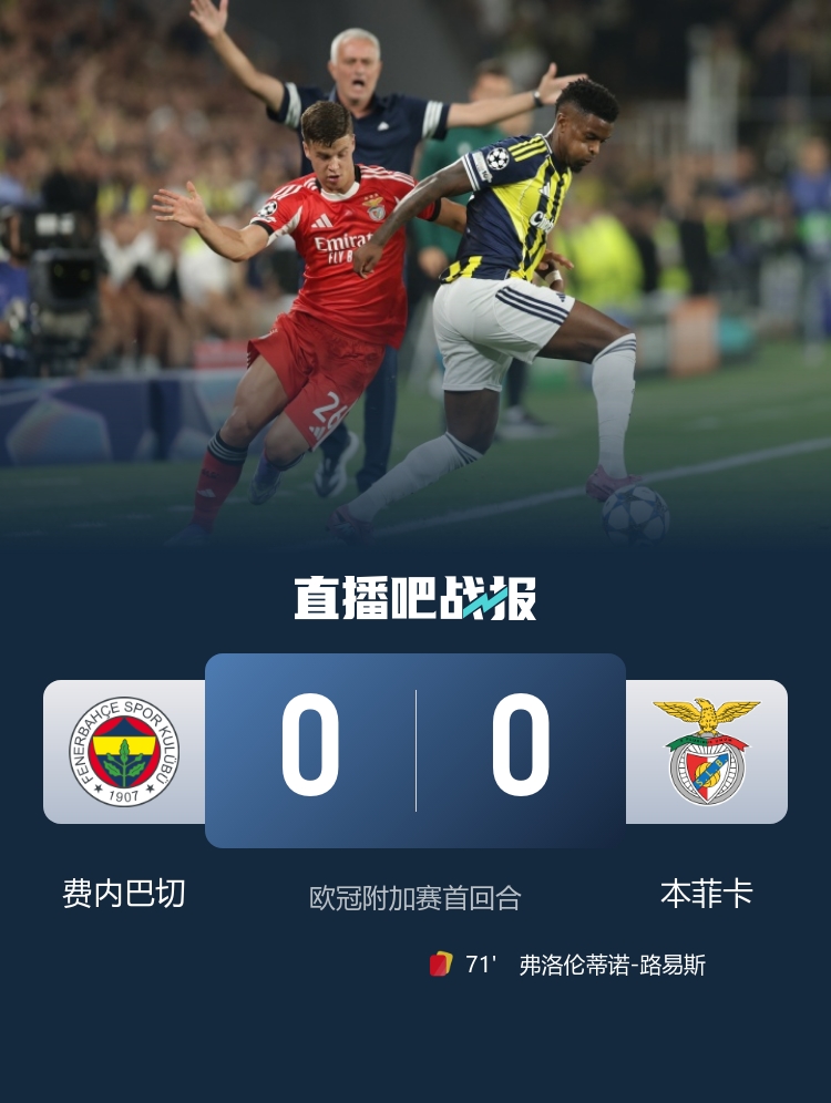 8月21日訊 歐冠附加賽首回合,費(fèi)內(nèi)巴切坐鎮(zhèn)主場薩拉克格魯球場迎戰(zhàn)本菲卡。上半場,阿克圖爾科格魯任意球被撲。易邊再戰(zhàn),弗洛倫蒂諾-路易斯兩黃被罰下,恩內(nèi)斯里補(bǔ)射被吹。最終費(fèi)內(nèi)巴切0-0本菲卡。雙方次回合將在28日凌晨移師本菲卡主場。