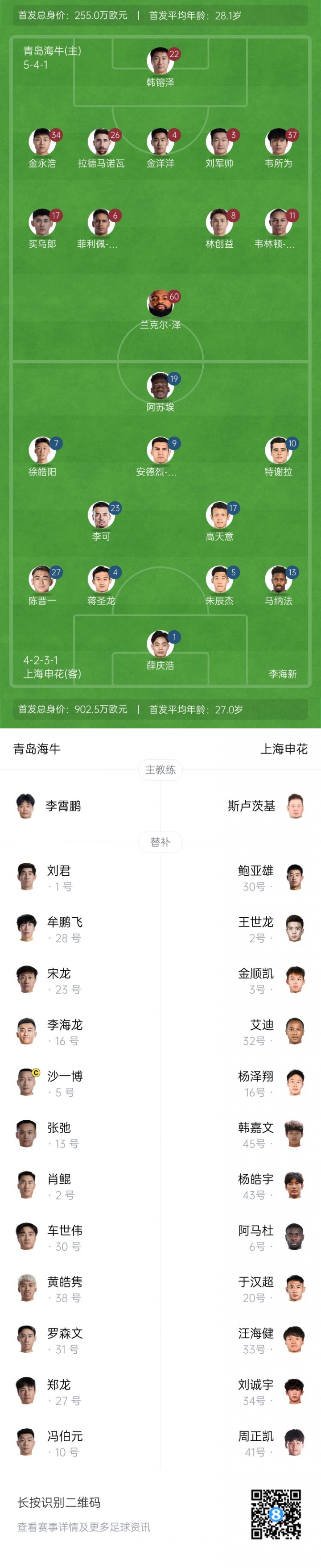 青島海牛首發(fā):22-韓镕澤、3-劉軍帥、4-金洋洋、26-尼古拉-拉德馬諾瓦(F)、37-韋所為、6-菲利佩-奧古斯托(F)、34-金永浩、8-林創(chuàng)益、17-買(mǎi)烏郎、11-韋林頓-席爾瓦(F)、60-蘭克爾-澤(F)