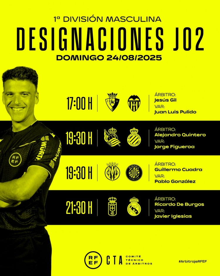 8月23日訊 西甲官方更新社媒動態(tài),公布了當?shù)貢r間8月24日(本周日)四場比賽的裁判安排。
