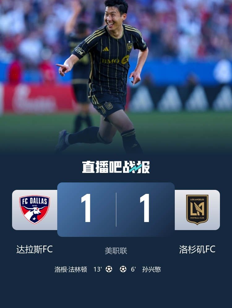 08月24日訊 美職聯(lián)達(dá)拉斯FCvs洛杉磯FC,孫興慜任意球破門,洛根-法林頓扳平比分,下半場博安加中框,最終洛杉磯FC與對(duì)手1-1握手言和。