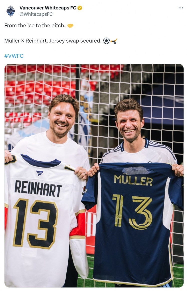 穆勒與效力于NHL佛羅里達(dá)美洲豹的加拿大冰球運(yùn)動員萊因哈特見面,并互換球衣,溫哥華白浪社媒曬出兩人的合照,配文:“從冰場到球場,穆勒X萊因哈特,互換球衣?!?/p>