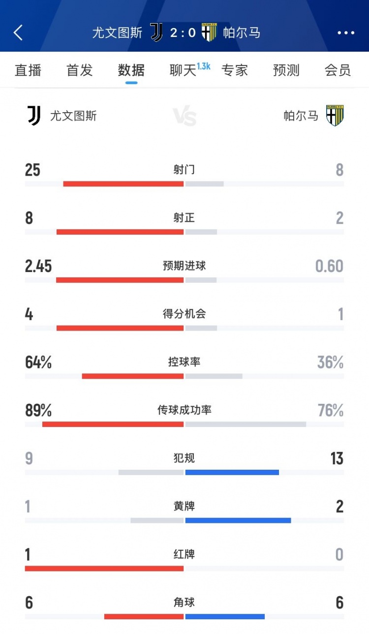8月25日訊 意甲聯(lián)賽第一輪,尤文圖斯2-0帕爾馬,取得聯(lián)賽開門紅。以下為雙方全場數(shù)據(jù)對比