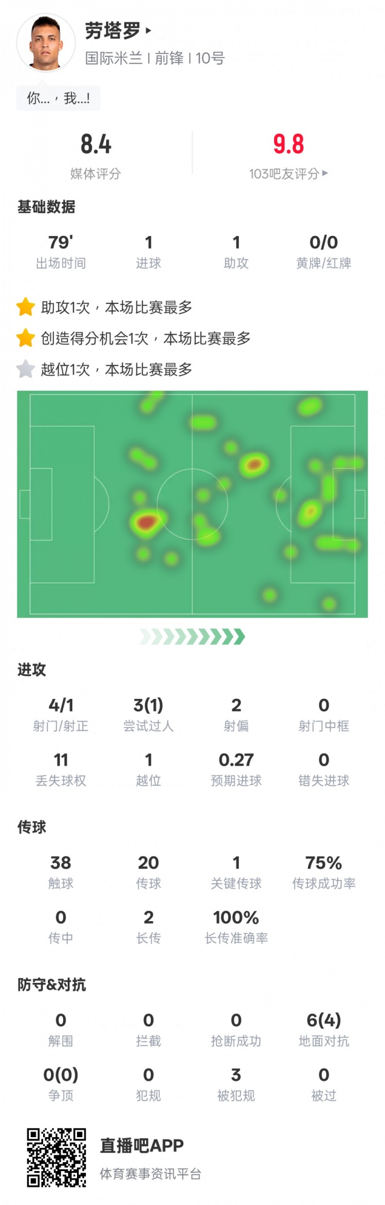 8月26日訊 2025-26賽季意甲首輪,國米5-0大勝都靈,勞塔羅首發(fā)出戰(zhàn),傳射建功,另外還送出1次關(guān)鍵傳球,評分8.4。