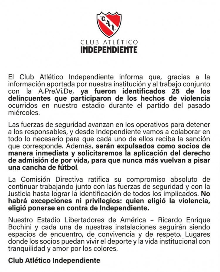 “董事會(huì)重申,我們將繼續(xù)與安全部門和司法部門合作,直到所有涉案人員都被識(shí)別出來。沒有例外也沒有特權(quán):選擇暴力的人就是選擇了站在獨(dú)立競(jìng)技俱樂部的對(duì)立面。”