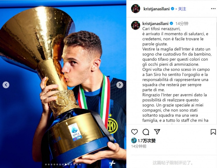 阿斯拉尼社媒寫(xiě)道:“親愛(ài)的國(guó)米球迷們,現(xiàn)在是向大家告別的時(shí)候了,相信我,找到合適的言辭真的不容易。穿上國(guó)米的球衣是我兒時(shí)懷揣的夢(mèng)想,那時(shí)我懷著滿心的崇拜為國(guó)米球員們加油。