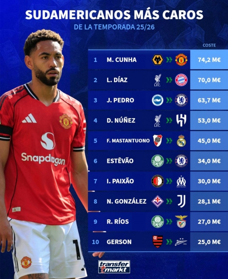 8月26日訊 轉(zhuǎn)會(huì)市場(chǎng)盤點(diǎn)了今年夏窗截至目前南美球員轉(zhuǎn)會(huì)費(fèi)榜單,其中庫尼亞居首,迪亞斯次席,具體榜單如下: