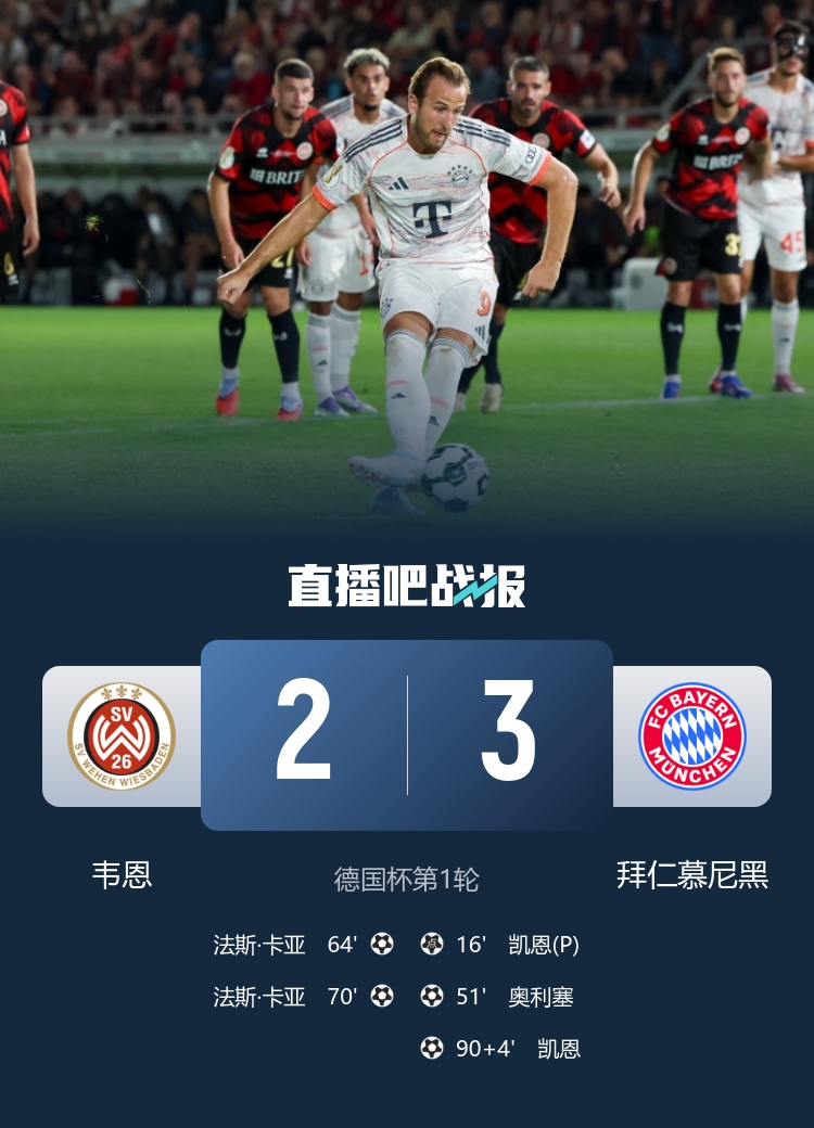 8月28日訊 北京時間8月28日凌晨2時45分,2025-26賽季德國杯第1輪在碧然德競技場展開角逐,拜仁慕尼黑客場對陣德丙隊韋恩。上半場凱恩點射首開記錄,下半場奧利塞擴大比分,迪亞斯屢失良機,卡亞連進兩球扳平,凱恩失點+補時絕殺。最終拜仁客場3-2險勝德丙隊韋恩,晉級德國杯第2輪。