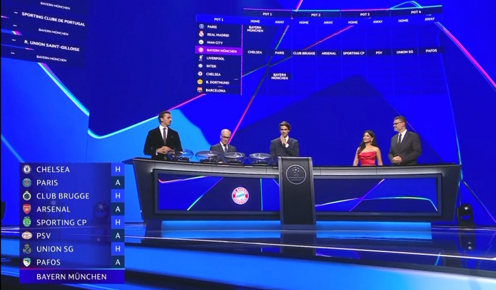 拜仁對手:切爾西(主)、巴黎(客)、布魯日(主)、阿森納(客)、葡萄牙體育(主)、埃因霍溫(客)、圣吉羅斯(主)、帕福斯(客)