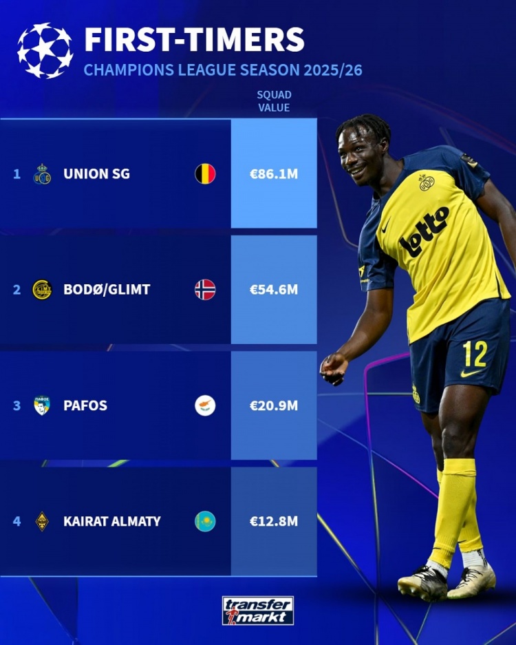 歐冠新軍球員總身價(jià)排名: