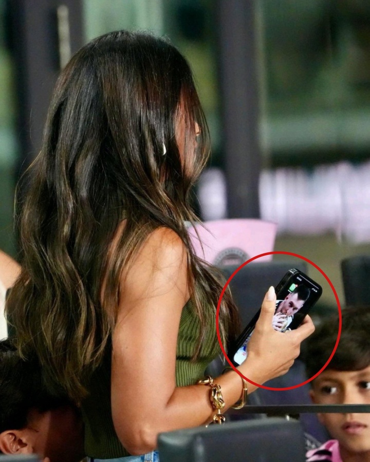 安東內拉本場比賽帶著兒子們也來到了現場觀賽,有球迷拍到安東內拉手機壁紙為梅西親吻大力神杯瞬間