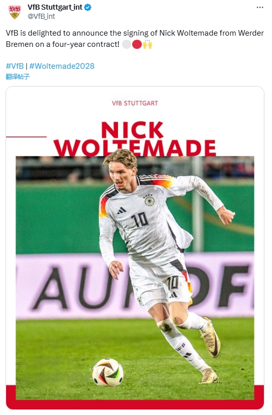 8月29日訊 斯圖加特前鋒沃爾特馬德即將加盟英超紐卡,據(jù)悉轉(zhuǎn)會(huì)費(fèi)可能高達(dá)9000萬歐。