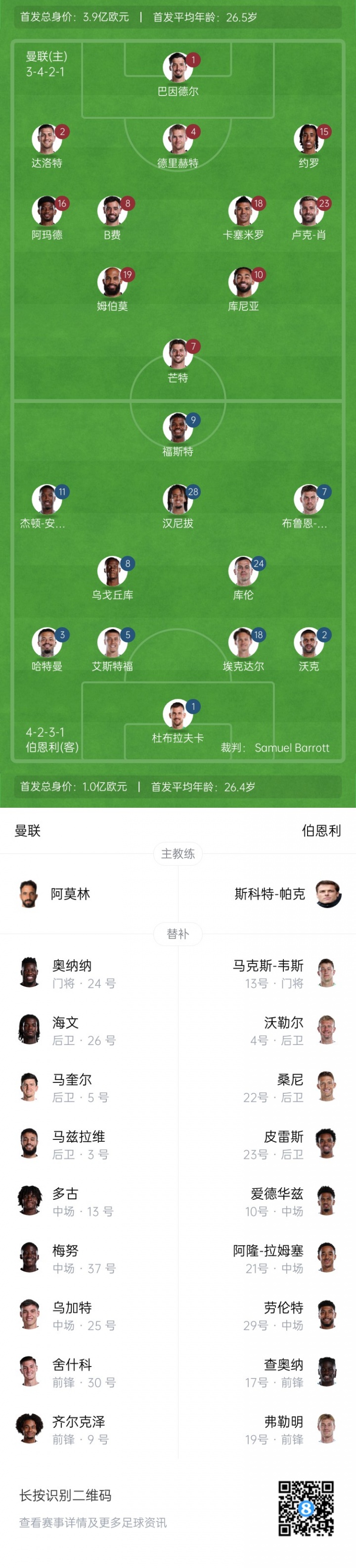曼聯(lián)首發(fā):1-巴因德爾、4-德里赫特、15-約羅、23-盧克-肖、2-達洛特、8-B費、16-阿瑪?shù)隆?8-卡塞米羅、7-芒特、10-庫尼亞、19-姆伯莫