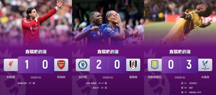 09月01日訊 英超第3輪比賽,切爾西2-0富勒姆、利物浦1-0阿森納、水晶宮3-0維拉。