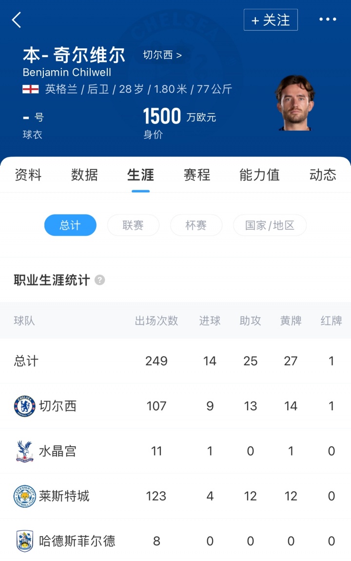 奇爾維爾時(shí)年28歲,英格蘭后衛(wèi)。上賽季他被切爾西租借至水晶宮,為水晶宮出場(chǎng)12次,取得1粒進(jìn)球。目前其德轉(zhuǎn)身價(jià)為1500萬(wàn)歐。