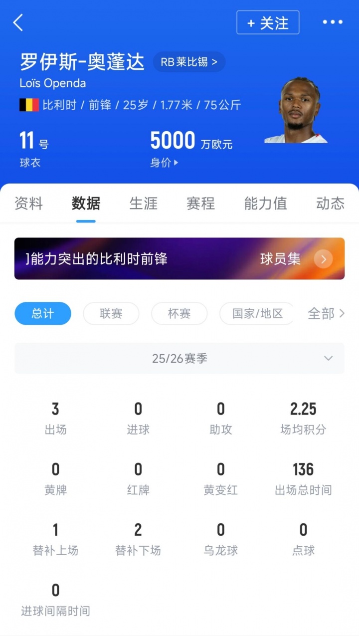 25歲的奧蓬達司職前鋒,上賽季為萊比錫各項賽事45場13球7助攻,德轉(zhuǎn)身價5000萬歐元。