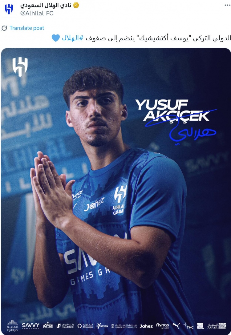 9月2日訊 根據(jù)利雅得新月官推發(fā)布的消息,該俱樂部從費(fèi)內(nèi)巴切隊(duì)簽下土耳其后衛(wèi)阿克塔什奇克,轉(zhuǎn)會費(fèi)為2200萬歐元。