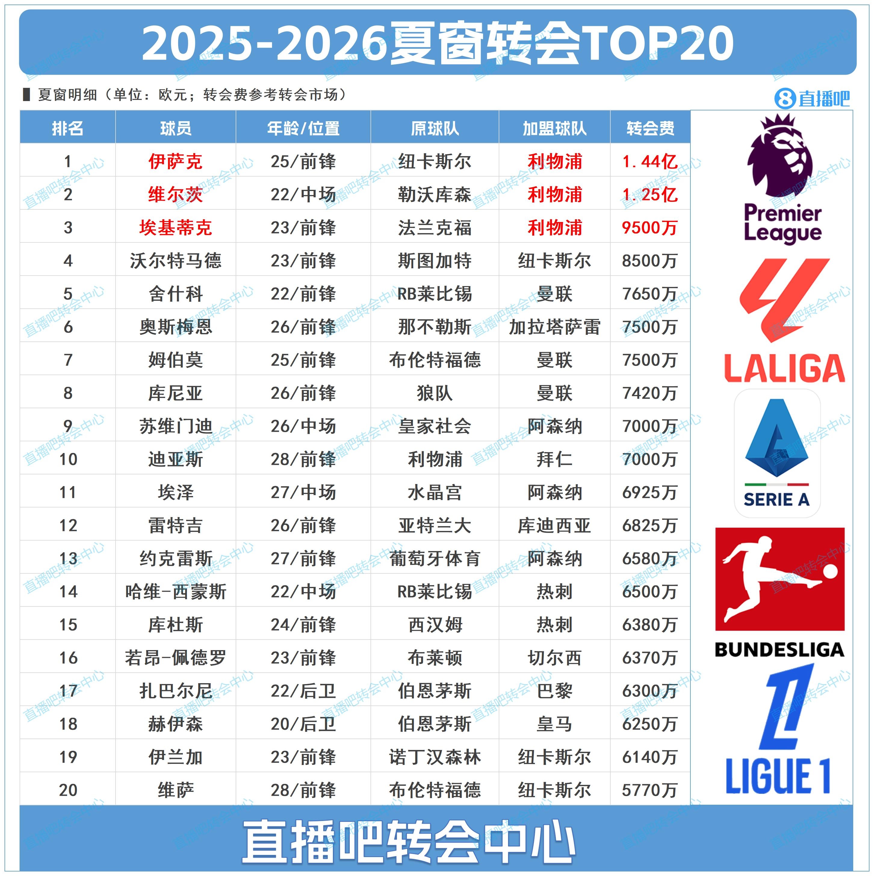 2025夏窗轉會TOP20【注:數(shù)據(jù)參考德國轉會市場網(wǎng)】
