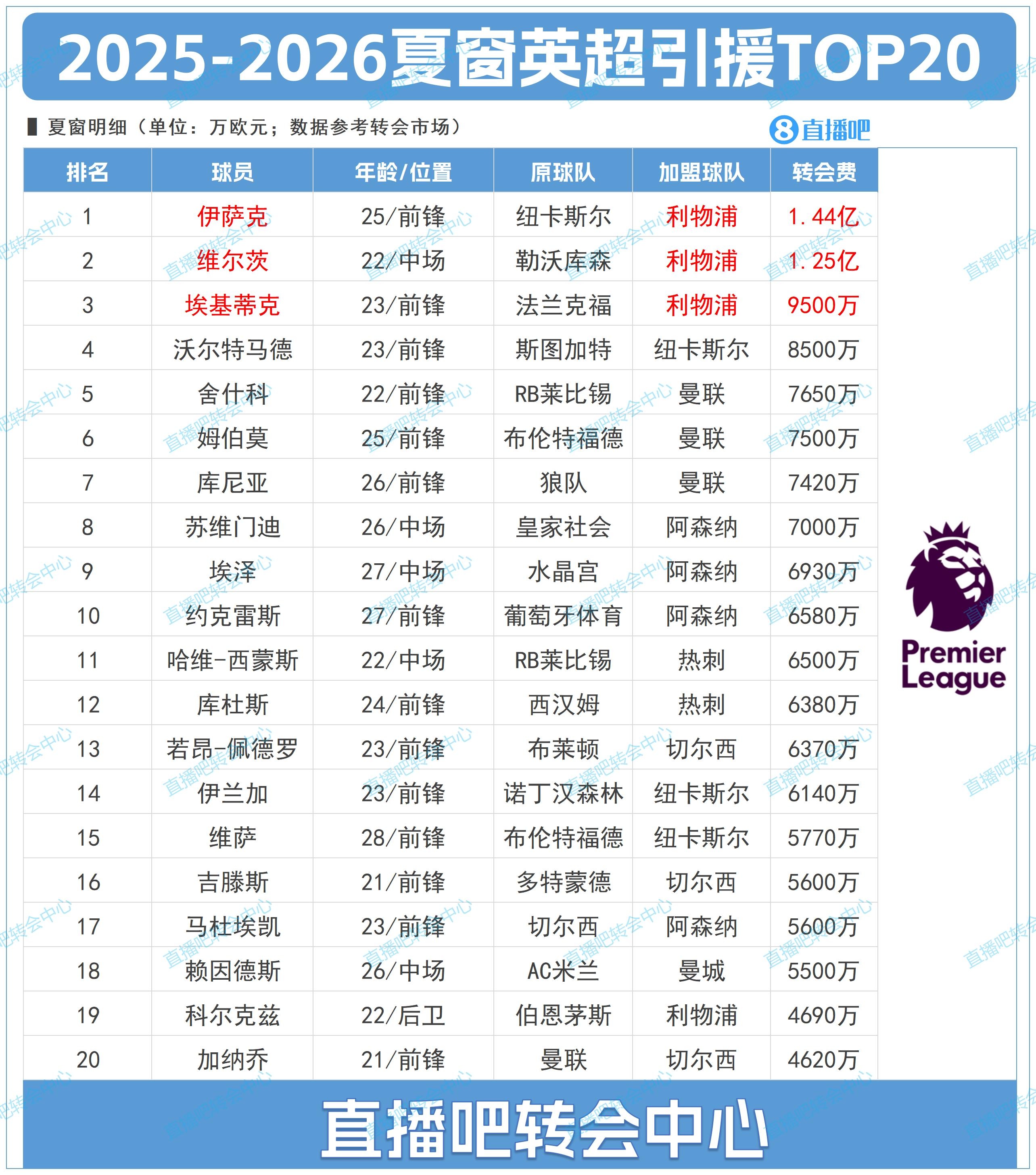 【轉(zhuǎn)會中心】為吧友們總結(jié)了英超夏窗TOP20轉(zhuǎn)會