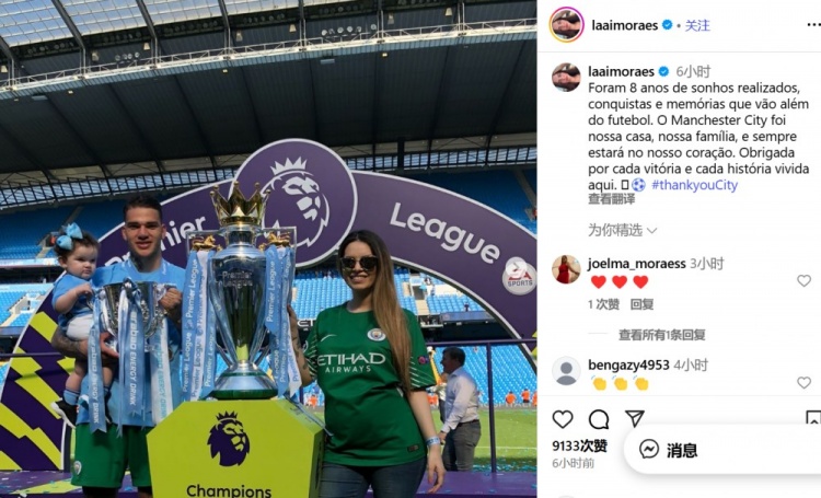 9月3日訊 在埃德森加盟費內(nèi)巴切后,他的妻子也發(fā)文告別了曼城。