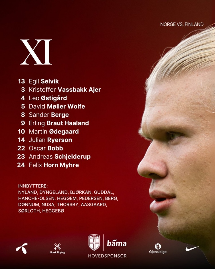 挪威首發(fā):13-塞爾維克、3-阿耶爾、4-厄斯蒂高、5-戴維-沃爾費(fèi)、8-桑德-博格、9-哈蘭德、10-厄德高、14-萊爾森、22-奧斯卡-鮑勃、23-施耶爾德魯普、24-米赫埃