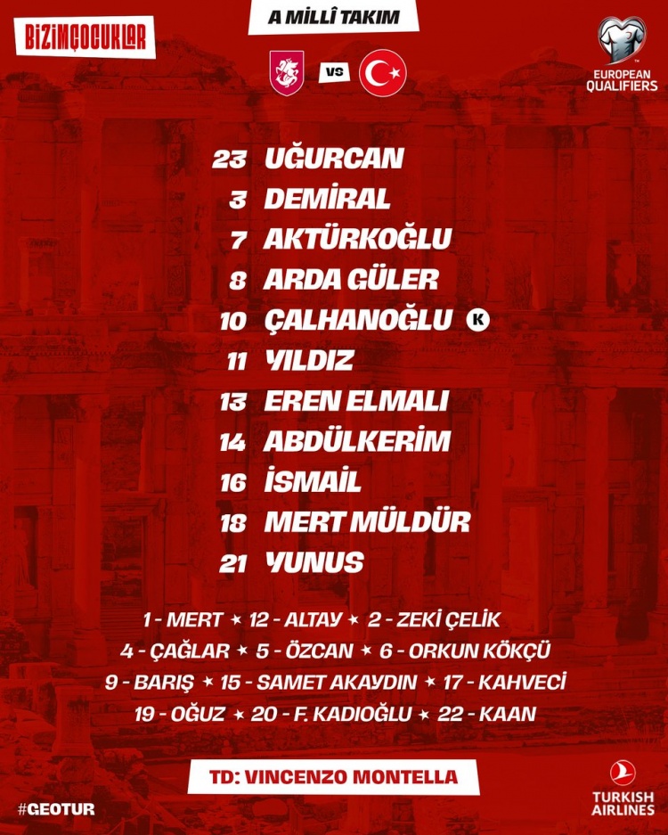 土耳其首發(fā):23-恰基爾、3-德米拉爾、7-阿克蒂爾克奧盧、8-居勒爾、10-恰爾汗奧盧、11-伊爾迪茲、13-埃爾馬西、14-巴達克、16-尤克塞克、18-穆爾杜、21-阿克昆