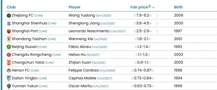 09月05日訊 著名足球數(shù)據(jù)統(tǒng)計(jì)機(jī)構(gòu)cies,計(jì)算出了各國聯(lián)賽的球員轉(zhuǎn)會(huì)價(jià)值榜,在中超球員中,王鈺棟獨(dú)占鰲頭。