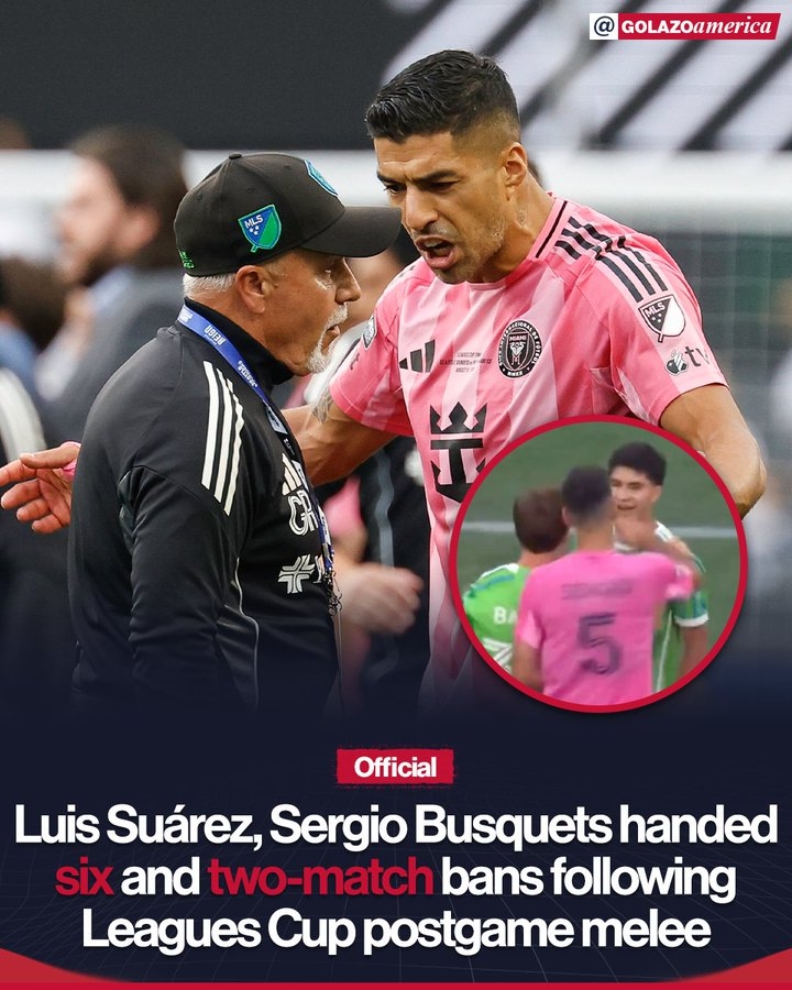 聯(lián)盟杯決賽邁阿密國際0-3不敵西雅圖海灣人,賽后雙方發(fā)生沖突,蘇亞雷斯向?qū)Ψ焦ぷ魅藛T吐口水,布斯克茨則向?qū)Ψ街袌霭蜖柤铀箵]拳。