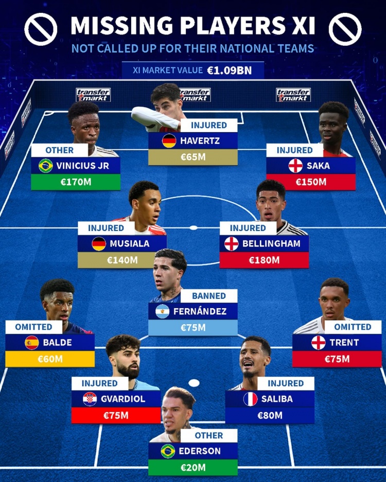 9月6日訊 德國(guó)轉(zhuǎn)會(huì)市場(chǎng)列出了缺席9月份國(guó)家隊(duì)比賽的球員陣容,維尼修斯、薩卡、穆西亞拉、貝林厄姆在列,德轉(zhuǎn)總價(jià)10.9億歐。