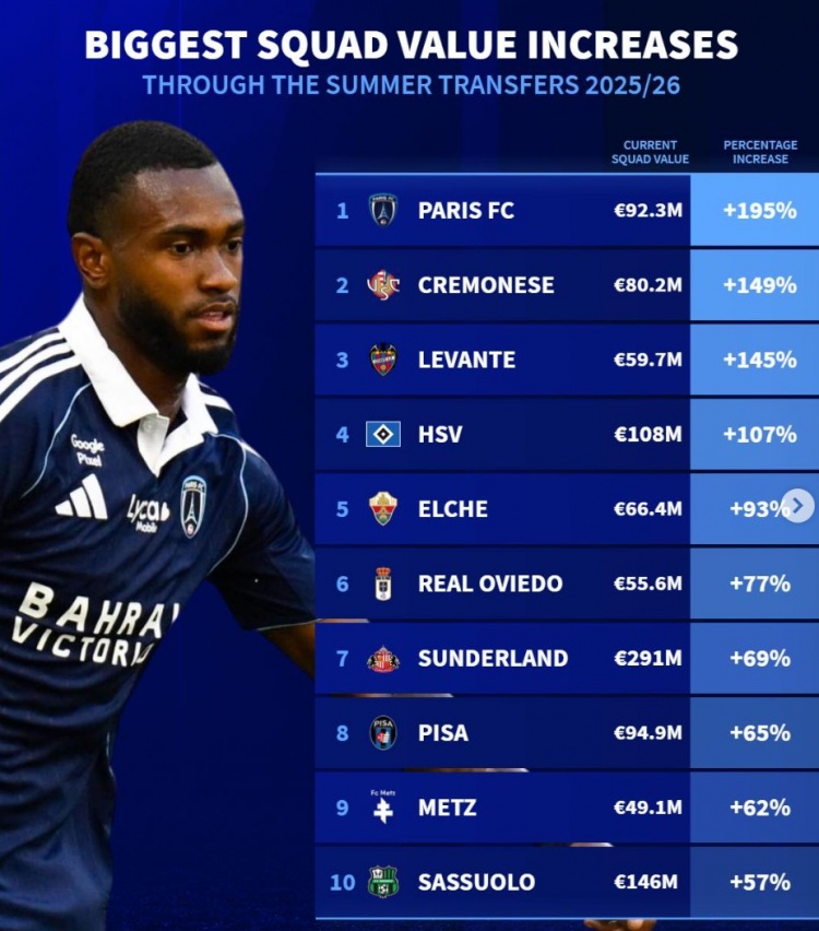 9月7日訊 《轉(zhuǎn)會市場》統(tǒng)計了今夏轉(zhuǎn)會窗過后的總身價上升比例情況,多家升班馬霸榜。