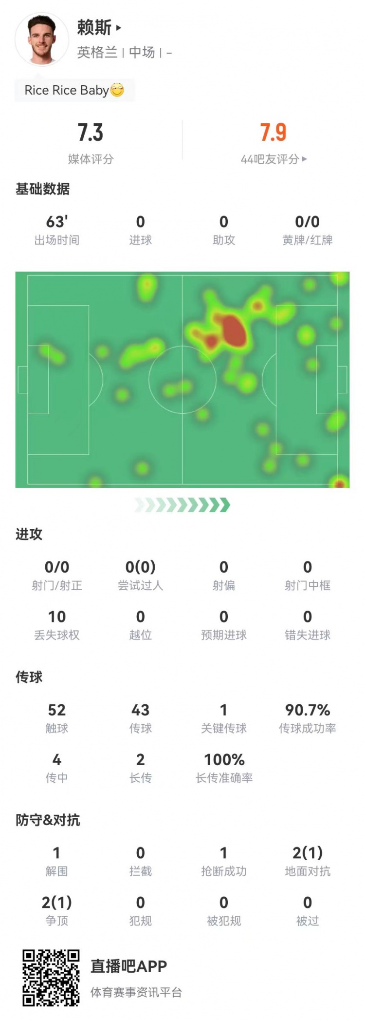 9月7日訊 英格蘭在本輪世預(yù)賽2-0領(lǐng)先安道爾,賴斯本場數(shù)據(jù)如下: