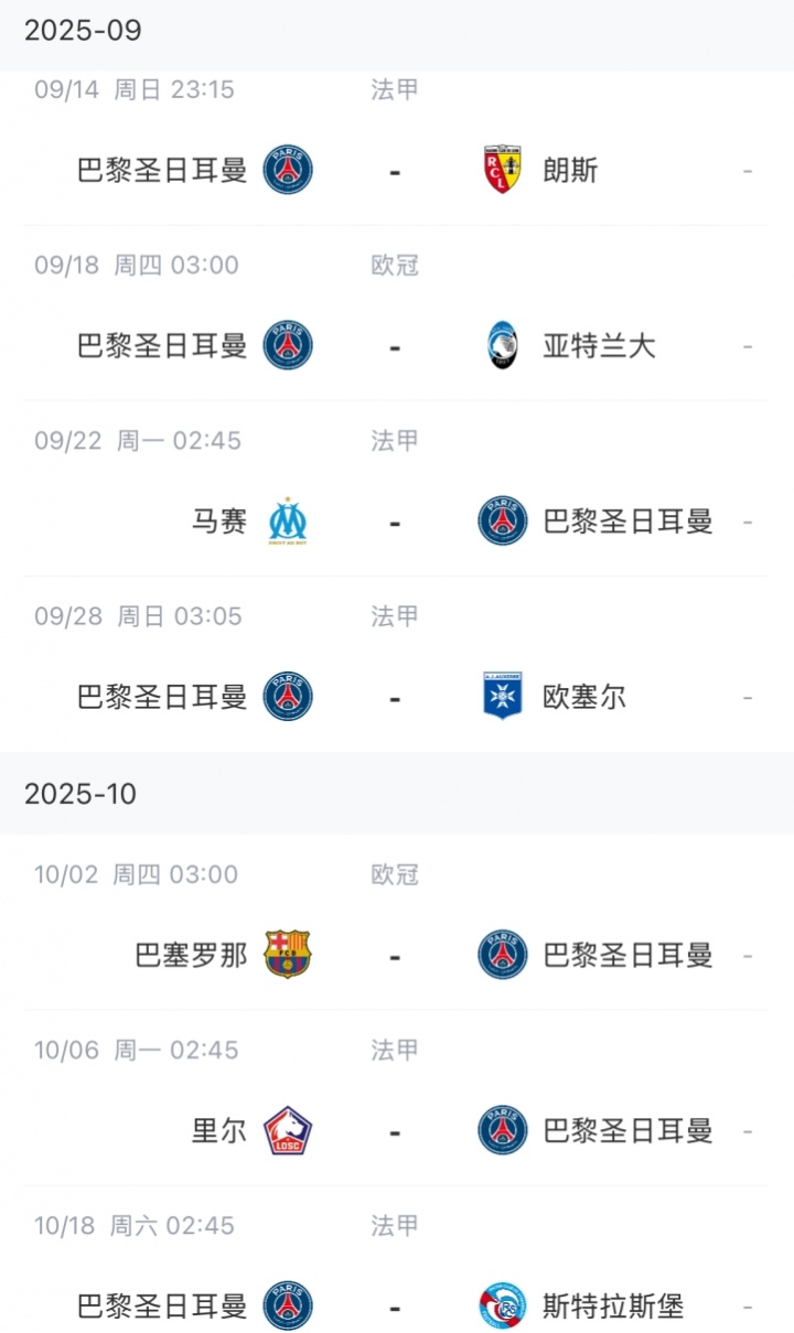 巴黎未來賽程如下,登貝萊無緣出戰(zhàn)10月初對陣巴薩的比賽: