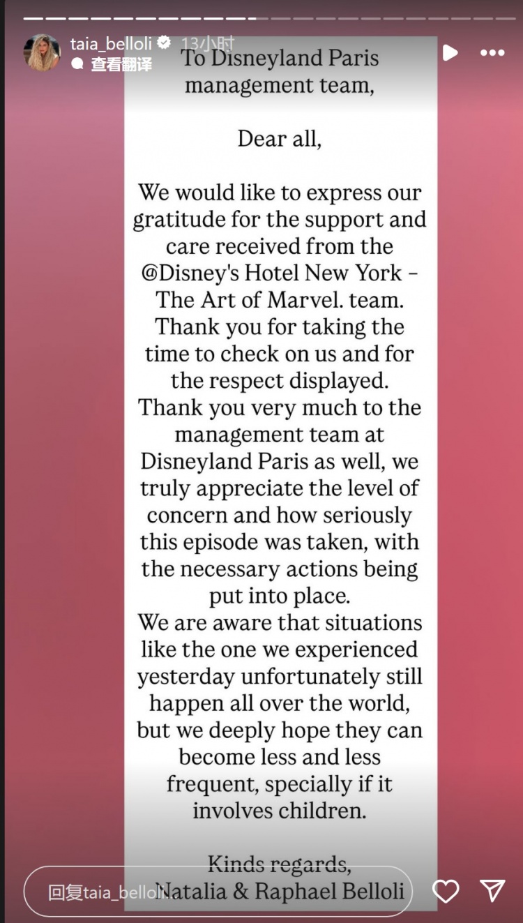 “致巴黎迪士尼樂(lè)園管理團(tuán)隊(duì),親愛(ài)的各位,我們對(duì)紐約迪士尼酒店-漫威藝術(shù)的支持和關(guān)懷表示感謝。感謝你們抽出時(shí)間關(guān)心我們,并展現(xiàn)出尊重。我們也非常感謝巴黎迪士尼樂(lè)園的管理團(tuán)隊(duì),我們真誠(chéng)地感激你們對(duì)此事件的重視以及所采取的必要措施。