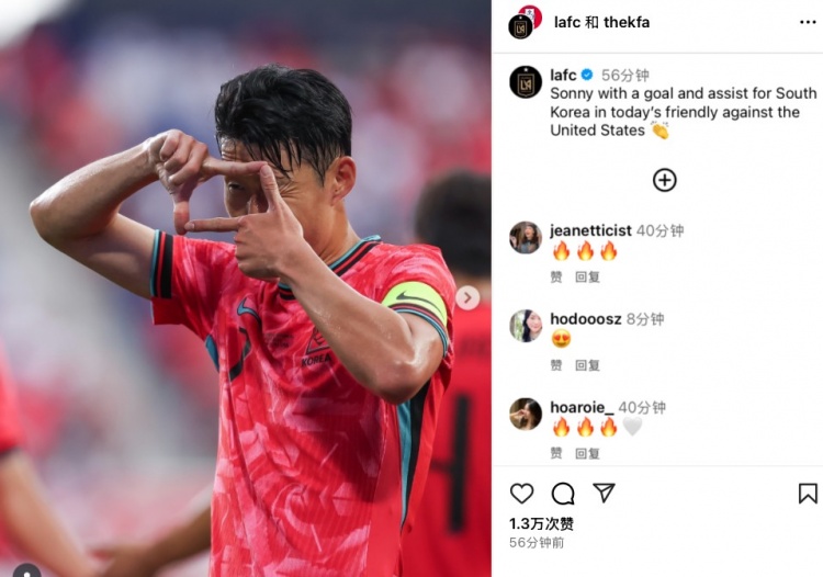 賽后韓足協(xié)和洛杉磯FC在ins上一同發(fā)布孫興慜標(biāo)志性的“拍照”慶祝動(dòng)作照,并配文寫(xiě)道:“在與美國(guó)隊(duì)的友誼賽中,Sonny為韓國(guó)隊(duì)傳射建功?!?/p>