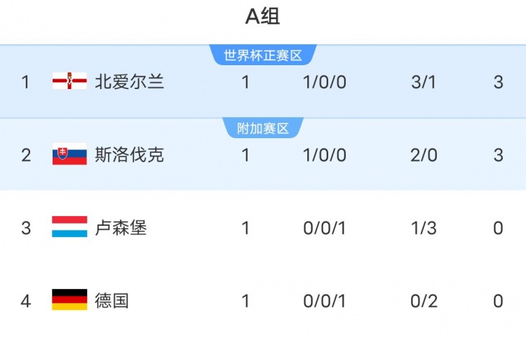 A組積分榜方面,德國(guó)目前1戰(zhàn)1負(fù)凈勝球-2&暫時(shí)墊底,北愛爾蘭排名第一。