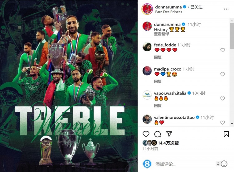 6月3日訊 巴黎門將多納魯馬更新社媒動態(tài),曬出三冠王個人海報。