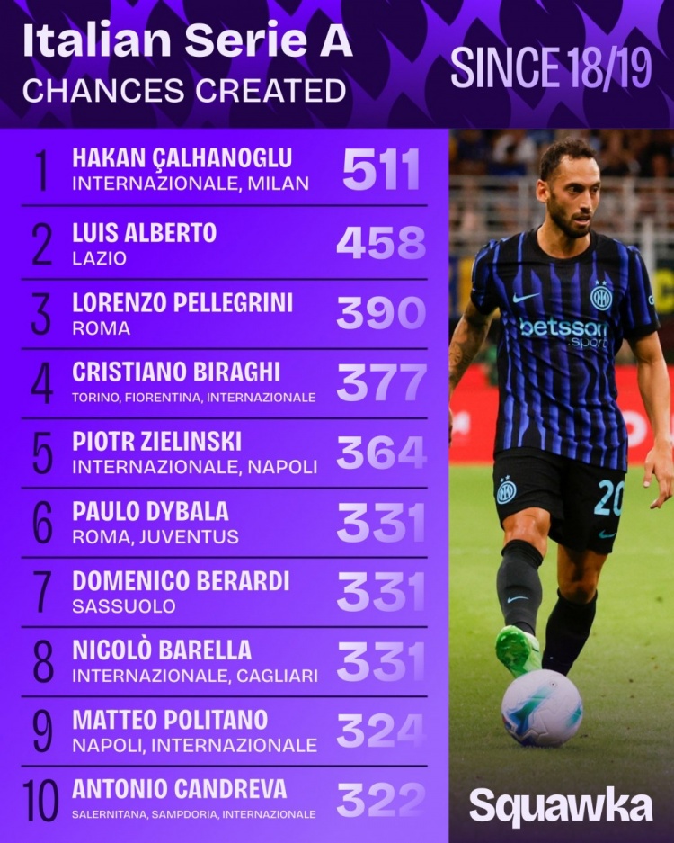 18-19賽季以來(lái)意甲創(chuàng)造機(jī)會(huì)榜: