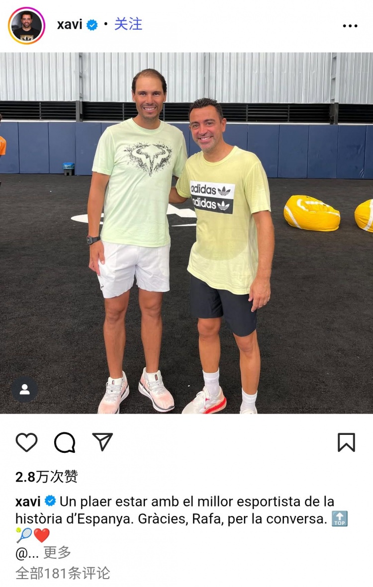 哈維寫道:“很榮幸能與西班牙歷史上最偉大的運動員在一塊。謝謝你,拉法,感謝這次交流?!?/p>