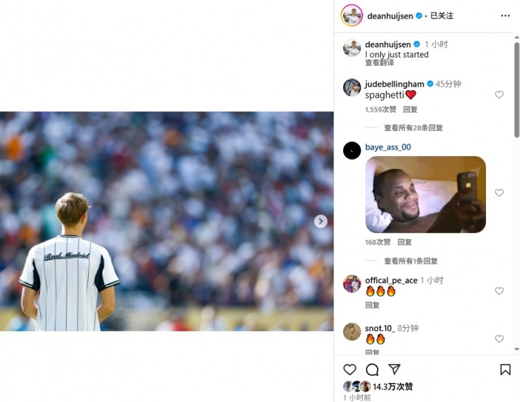 9月8日訊 皇馬后衛(wèi)赫伊森在社交媒體發(fā)文,貝林厄姆評(píng)論區(qū)互動(dòng)。