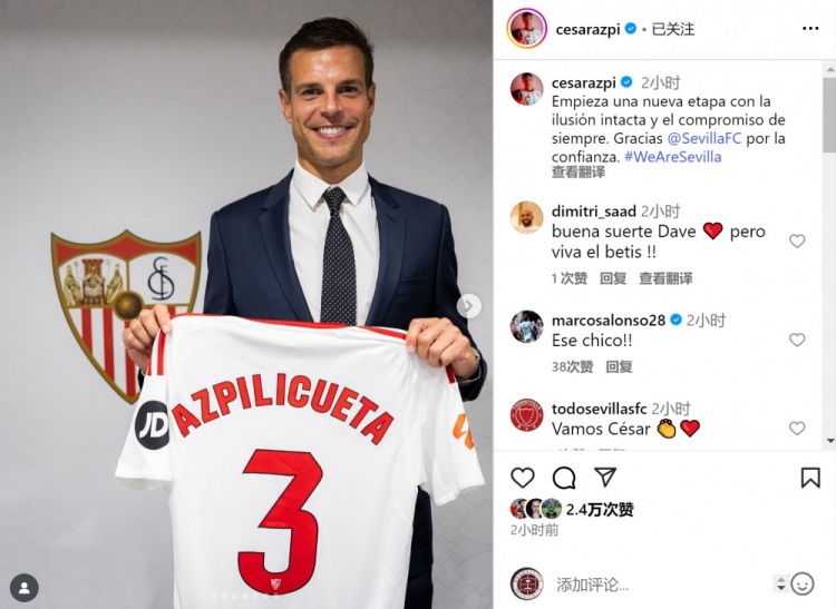 阿斯皮利奎塔自由身加盟塞維利亞,他在社交媒體上曬出展示球衣的照片,并寫道:“懷揣著不變的熱情與一如既往的承諾,開啟嶄新征程。感謝塞維利亞的信任?!?/p>