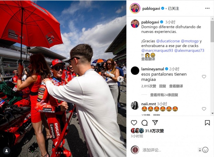 加維受邀現(xiàn)場觀看MotoGP加泰羅尼亞站比賽,他在社交媒體上曬出照片,配文:“不一樣的周日,享受全新的體檢?!?/p>