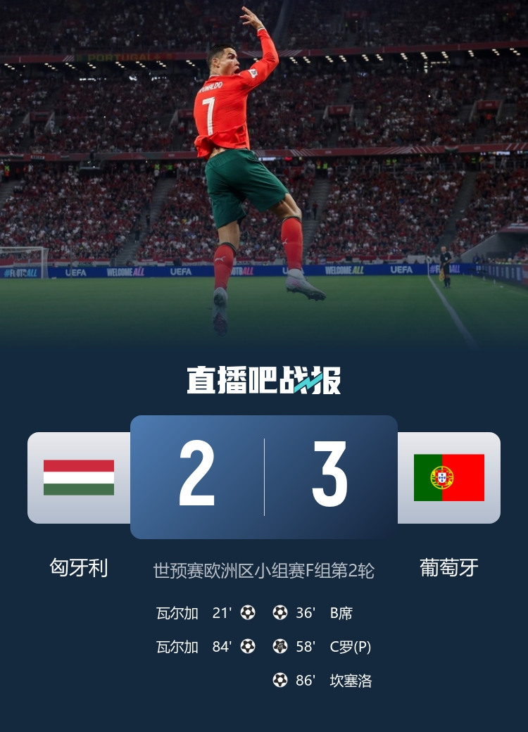 9月10日訊 北京時間9月10日凌晨2時45分,世預(yù)賽歐洲區(qū)小組賽F組第2輪在費倫茨·普斯卡什體育場展開角逐,葡萄牙客場對陣匈牙利。上半場瓦爾加首開記錄,C羅失良機,B席扳平比分,坎塞洛連場助攻,下半場C羅造點+連場破門,打入39球成為世預(yù)賽歷史射手王,瓦爾加追平,坎塞洛和B席互獻傳射助球隊再度領(lǐng)先。最終葡萄牙客場3-2戰(zhàn)勝匈牙利,F(xiàn)組積分榜方面,葡萄牙兩連勝積6分領(lǐng)跑,匈牙利積1分位居第3。