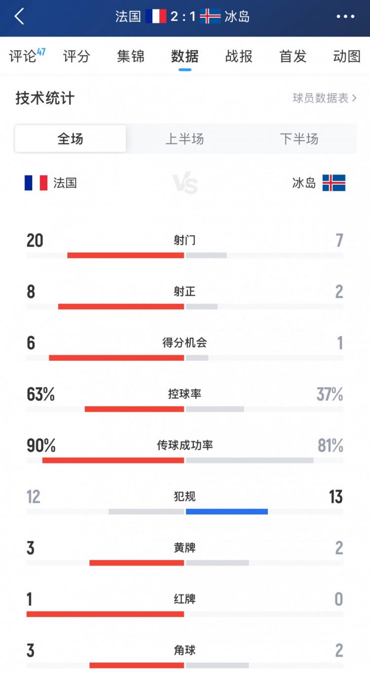 兩隊全場數(shù)據(jù)如下(主隊法國在前):