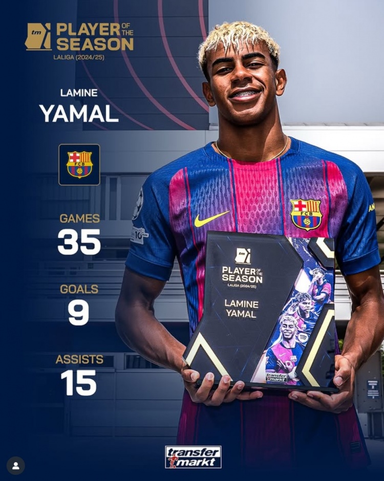 9月12日訊 《轉(zhuǎn)會市場》官方宣布,18歲的巴薩邊鋒亞馬爾當(dāng)選德轉(zhuǎn)評選的24-25賽季西甲MVP。
