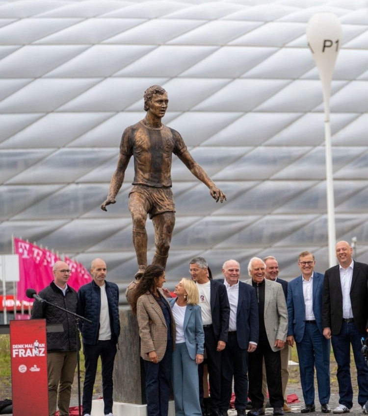 9月13日訊 安聯(lián)球場外的貝肯鮑爾雕像已經(jīng)揭幕,拜仁高層們一同在雕像前合影。