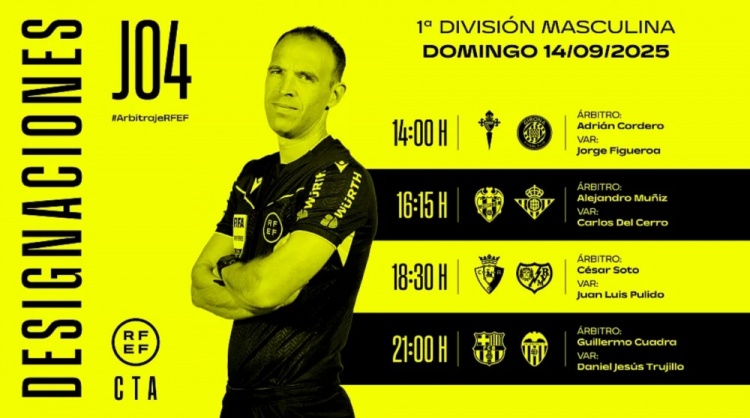 9月13日訊 當(dāng)?shù)貢r(shí)間周日(9月14日)進(jìn)行的西甲第4輪四場(chǎng)比賽裁判已經(jīng)確定,具體任命如下: