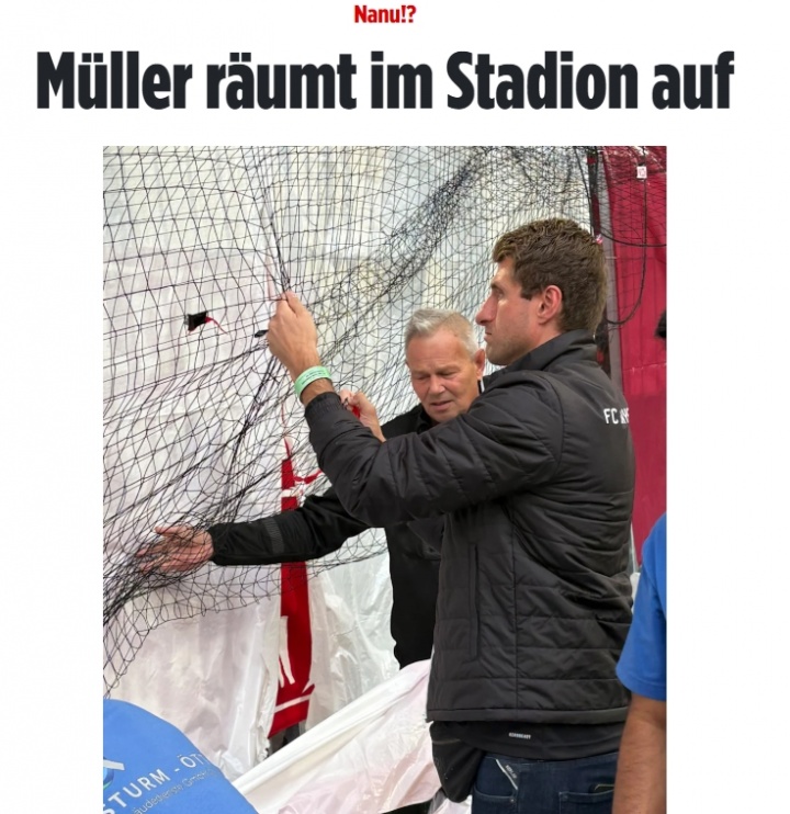 在拜仁5-0大勝漢堡的比賽開賽前,安聯(lián)球場內(nèi)突然出現(xiàn)一位與穆勒極為相似的男子。他身穿俱樂部夾克,正在協(xié)助清理南看臺死忠球迷剛剛用于TIFO表演的紅白塑料膜。