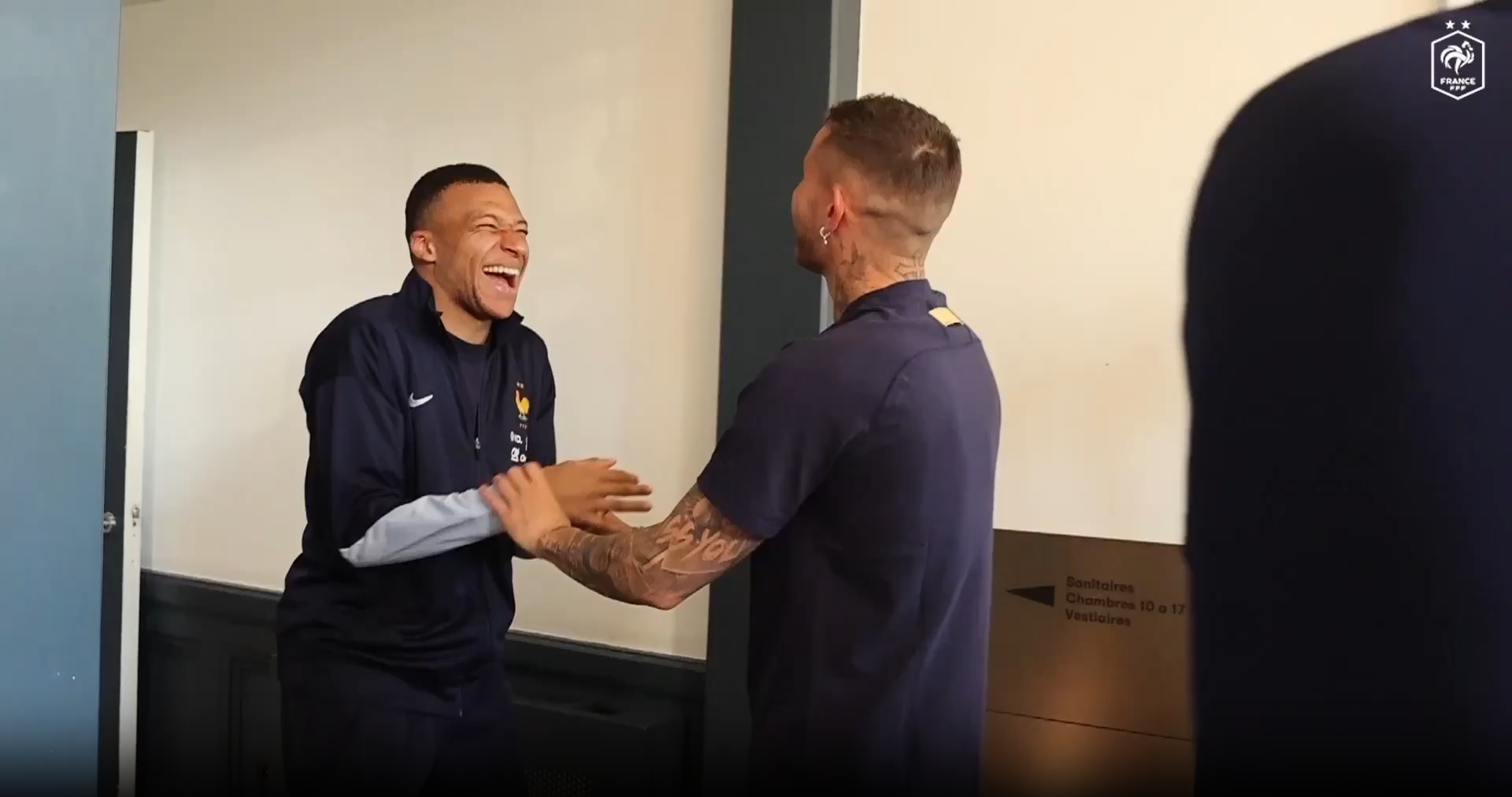 法國國家隊(duì)官推曬視頻,5位剛剛奪得歐冠冠軍的球員到國家隊(duì)報(bào)到,隊(duì)長(zhǎng)姆巴佩開心大笑,與他們握手擁抱親切互動(dòng)。