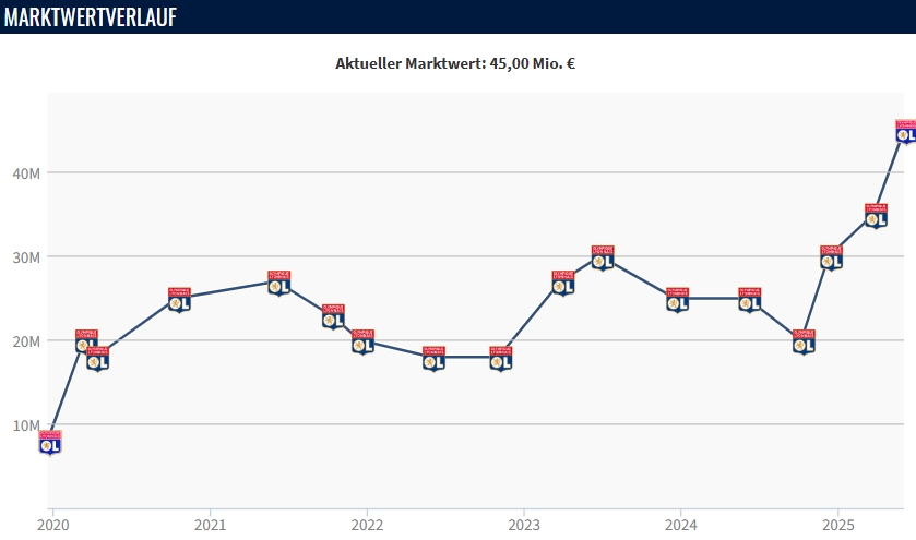 06月03日訊 今日德轉(zhuǎn)更新法甲球員身價(jià),21歲的里昂球員切爾基身價(jià)暴漲1千萬(wàn),目前4500萬(wàn)也是球員生涯身價(jià)新高。