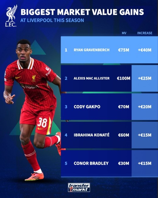 本賽季利物浦隊(duì)內(nèi)身價(jià)上漲榜: