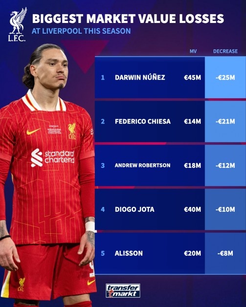 本賽季利物浦隊(duì)內(nèi)身價(jià)下跌榜: